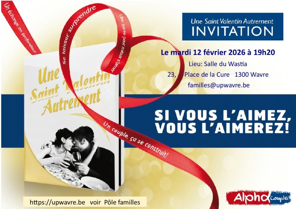 L’Unité Pastorale de Wavre organise une soirée Saint Valentin autrement le mercredi 12 février 2026 de 19h20 à 22h dans la salle du Wastia à Wavre (Place de la Cure à 1300 Wavre).