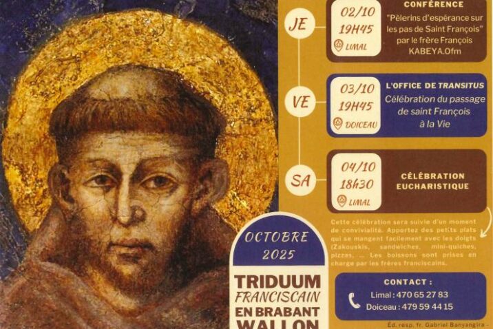 Les deux paroisses franciscaines du Brabant Wallon vous invitent chaleureusement à leur prochain Triduum franciscain. Bienvenue à tous !